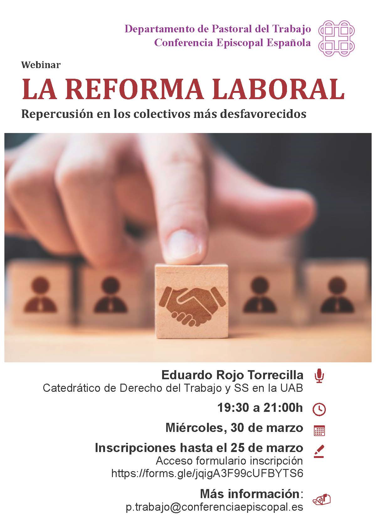 El Departamento de Pastoral del Trabajo ha creído conveniente programar esta webinar para conocer y profundizar en la actual reforma laboral fruto de la recuperación del dialogo social. Para ello contamos con D. Eduardo Rojo Torrecilla, Catedrático de Derecho del Trabajo y Seguridad Social en la Universidad Autónoma de Barcelona (UAB).