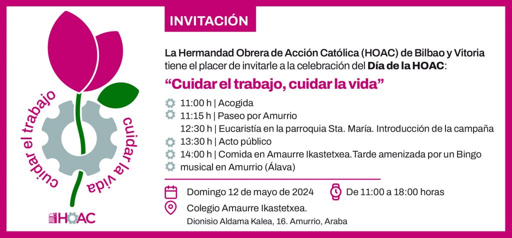 Con el lema “Cuidar el trabajo, cuidar la vida”, la Hermandad Obrera de Acción Católica (HOAC), de Bilbao y Vitoria, celebrarán este domingo su jornada de encuentro anual. La cita será en el colegio Amaurre Ikastetxea, de Amurrio, de 11:00 a 18:00 h.