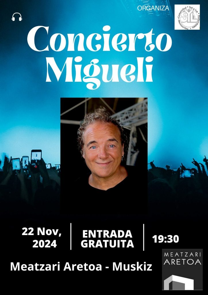 Migueli kantautoreak kontzertua eskainiko dau datorren barikuz, azaroak 22, Muskizeko Meatzari aretoan, 19:30etan, Gatz eta Argi komunitatearen eskutik. Komunitateko kideek dei egin dabe kantautorearen kontzertura -sarrera doan- koateko. Euren esanetan, “urte asko daroaz musikari lotuta eta bere umorea, gizarte konpromisoa eta biziaren aldeko grina kontzertuetan be agertzen da”.