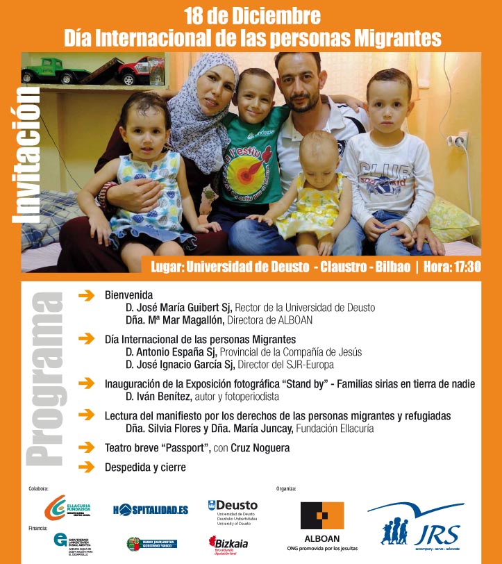 El próximo 18 de diciembre se celebra el Día Internacional de las Personas Migrantes y por ese motivo queremos invitarte al acto conmemorativo que hemos organizado y que tendrá lugar el claustro de la Universidad de Deusto, en Bilbao a las 17.30 de la tarde. Durante el mismo tendrá lugar la inauguración de la exposición Stand by. Familias refugiadas en Siria.